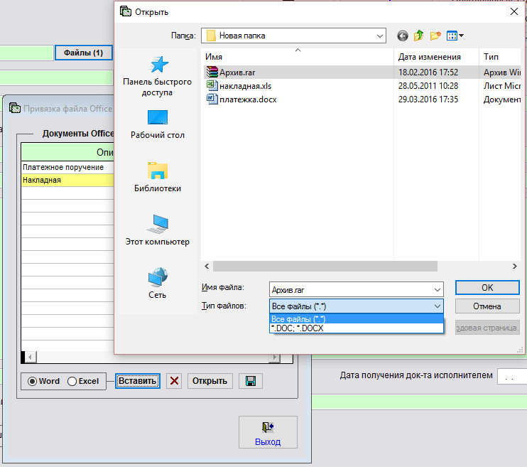 Выберите тип файлов "Все файлы", затем выберите нужный файл приложения к данному входящему, например архив RAR и нажмите ОК.