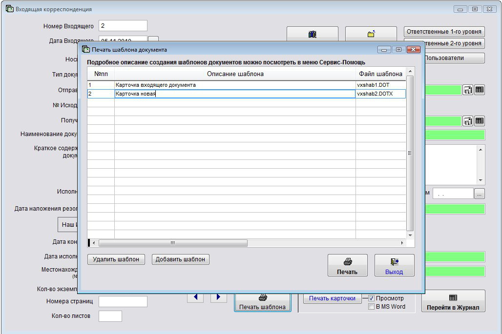 Откроется раздел "Печать шаблона документа", в котором можно добавить/удалить/распечатать шаблоны произвольных документов к входящему.