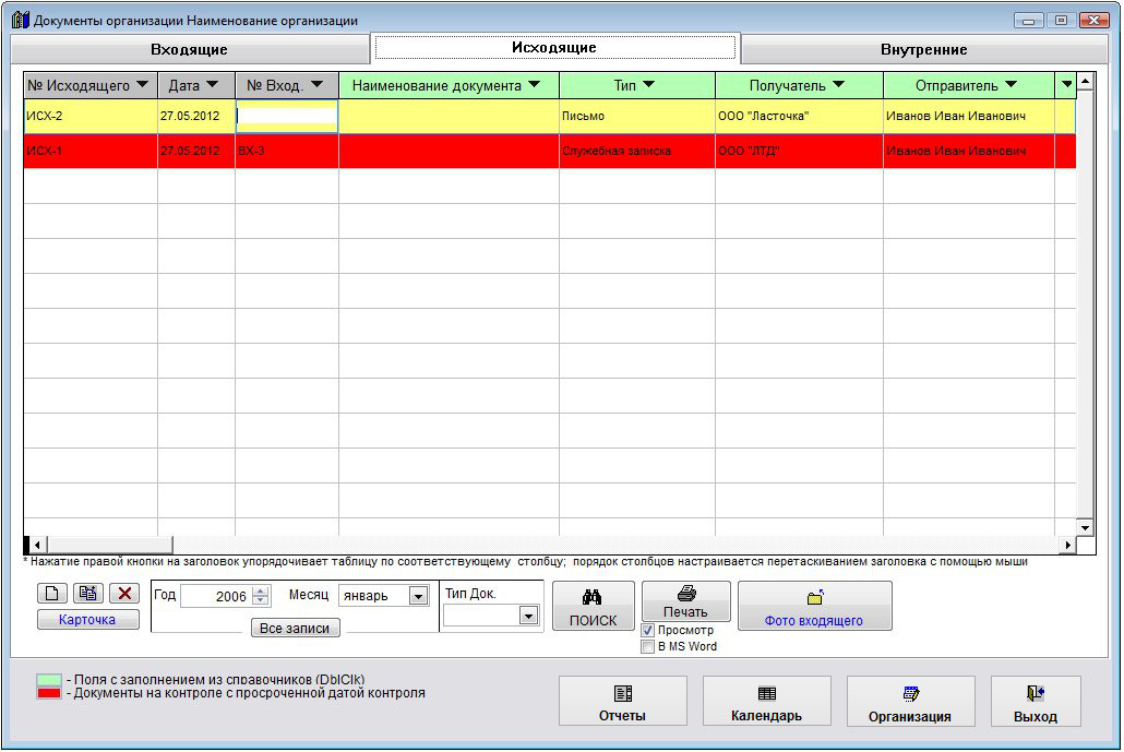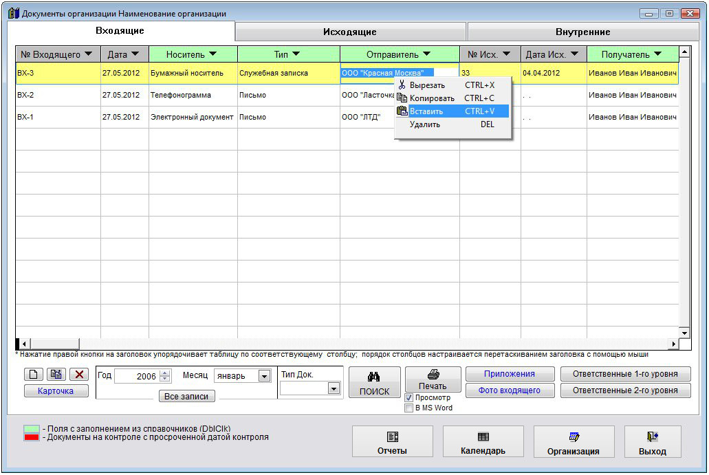 Входящие документы, находящиеся на контроле, у которых просрочена дата контроля, выделяются в журнале соответствующим (красным) цветом.