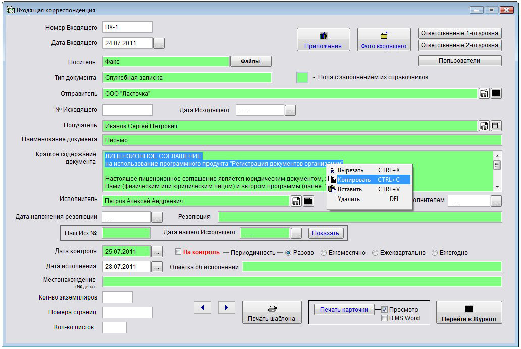 Аналогичным образом копирование/вставка осуществляется в любом разделе программы - карточке документа, дополнительных журналах, справочниках.