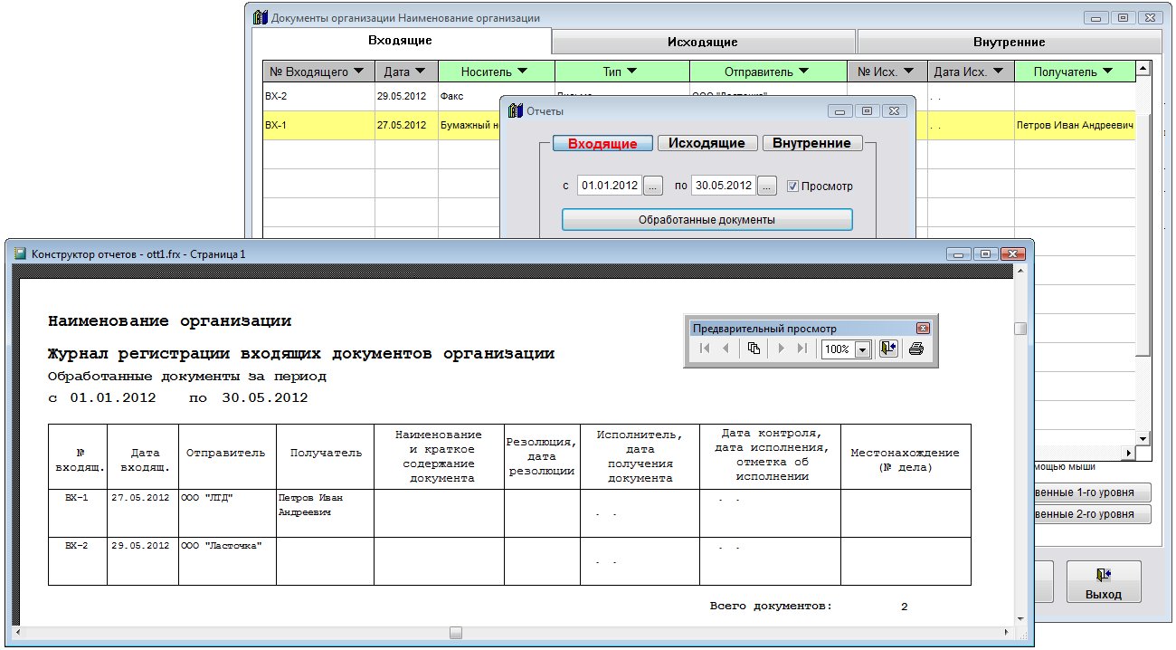 Для печати списка обработанных входящих документов нажмите кнопку "Отчеты" в правой нижней части формы.