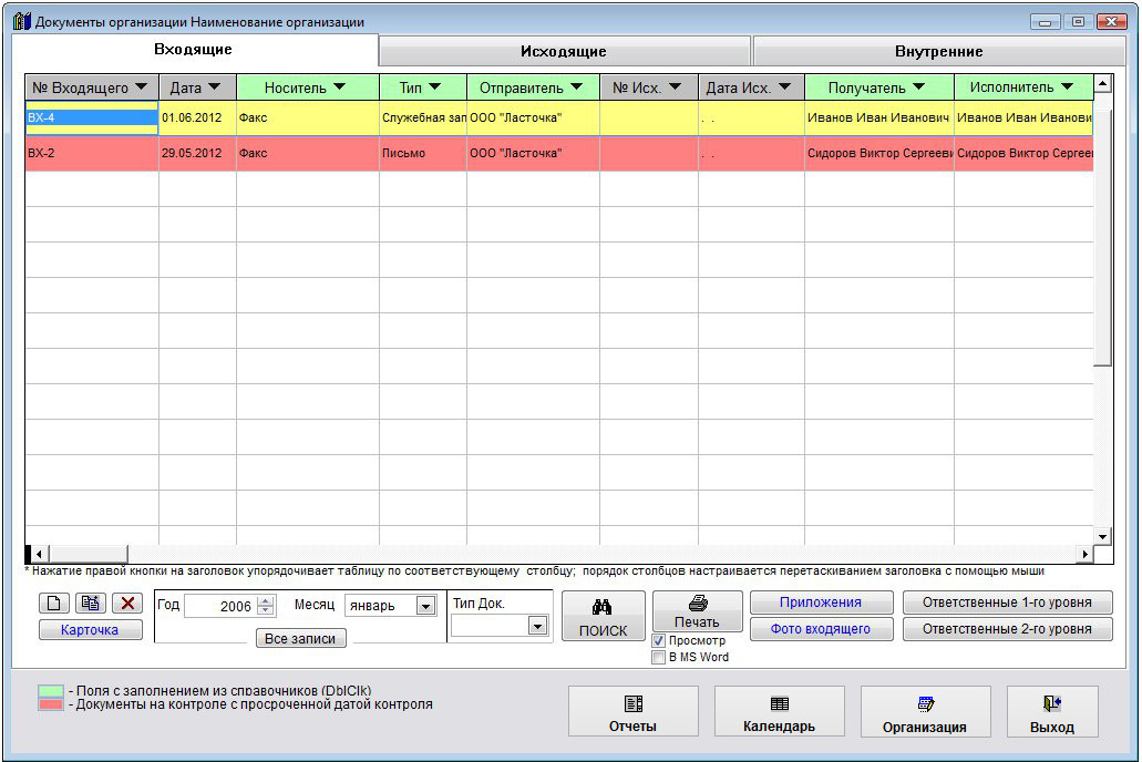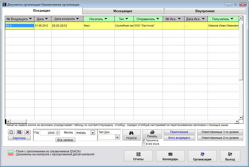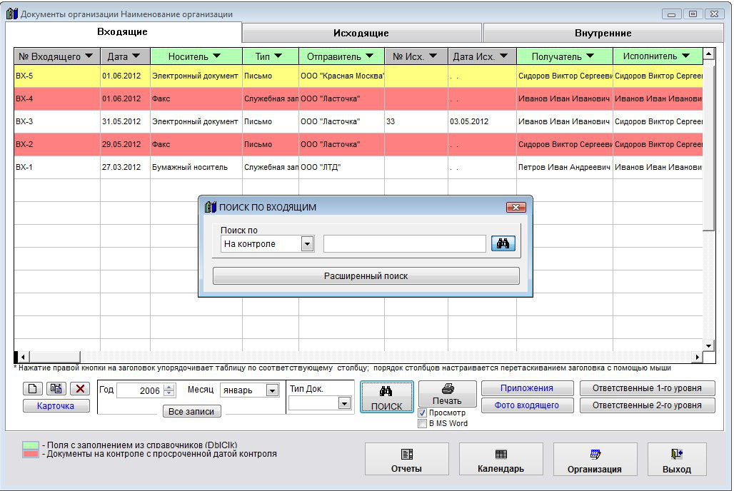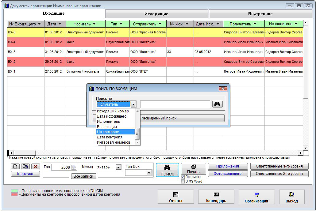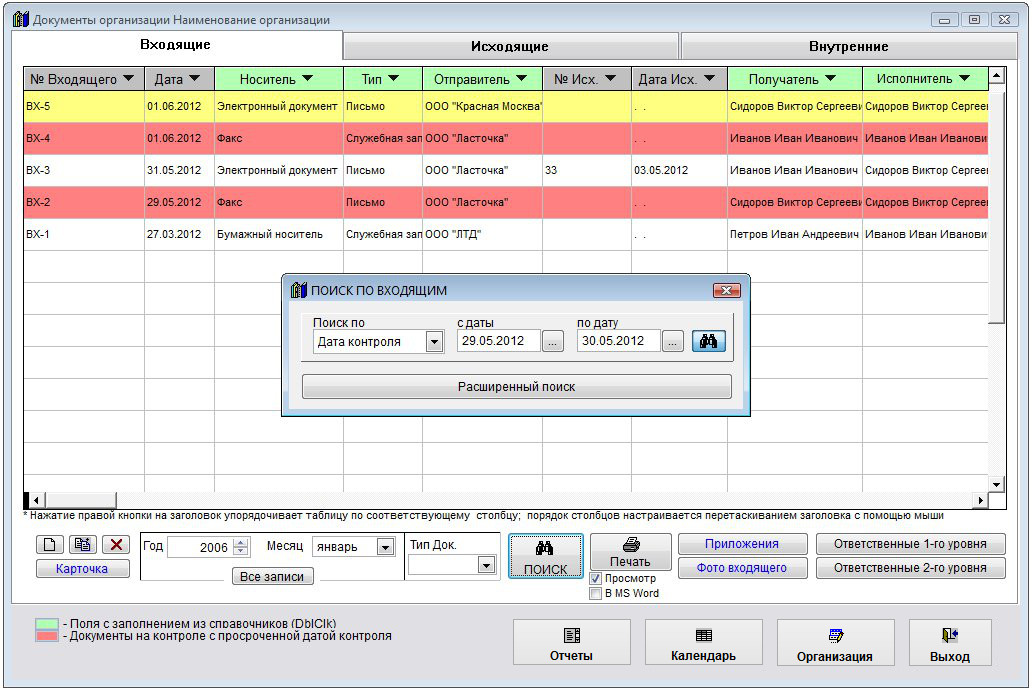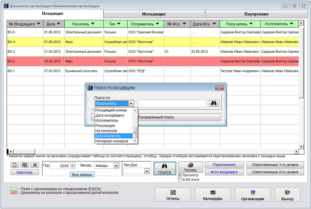 В журнале входящих отобразятся только те записи, которые соответствуют критерию поиска, т.е. в карточках которых установлена галочка Контроль (независимо от даты контроля и результата исполнения).