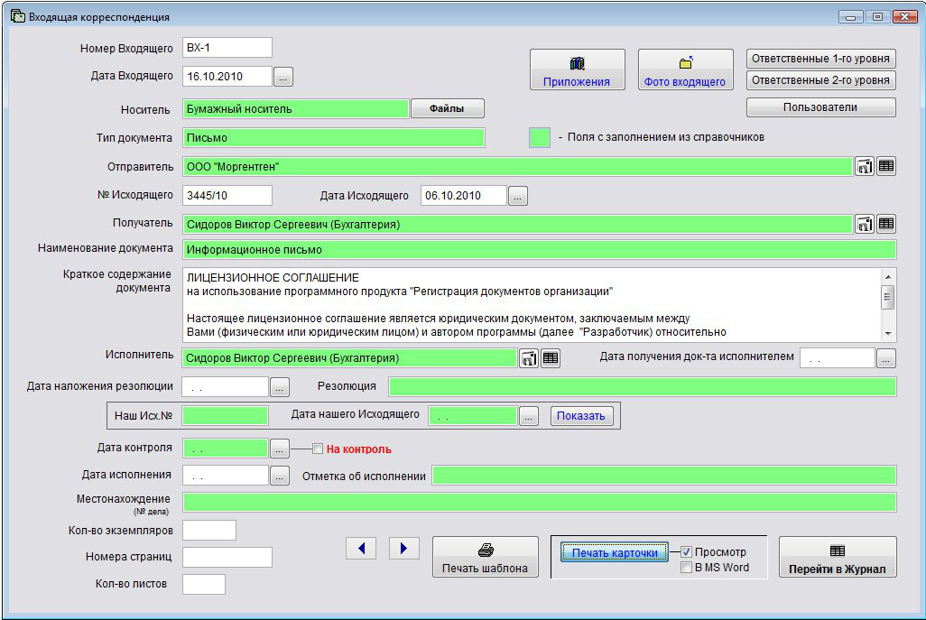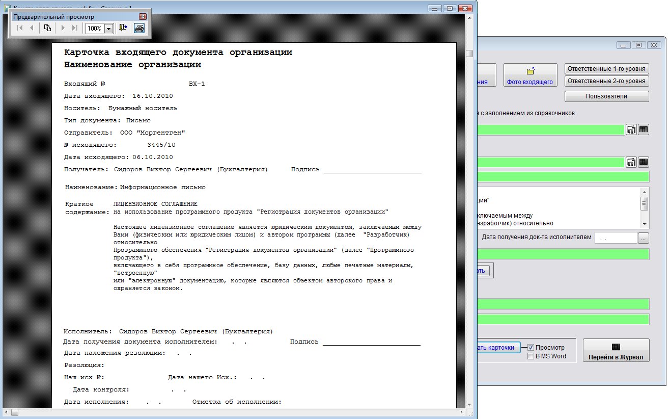 Карточка входящего будет сформирована в MS Word либо, при соответствующей