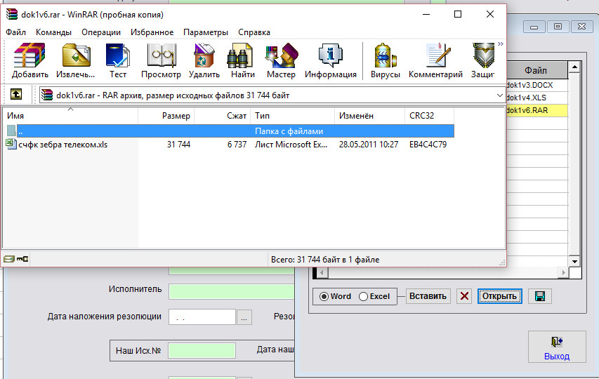 При нажатии кнопки "Открыть" рядом с именем прикрепленного файла с расширением RAR прикрепленный файл откроется в программе, назначенной в Windows для открытия данного типа файлов (для файлов с расширением RAR - WinRAR дибо WinZip).