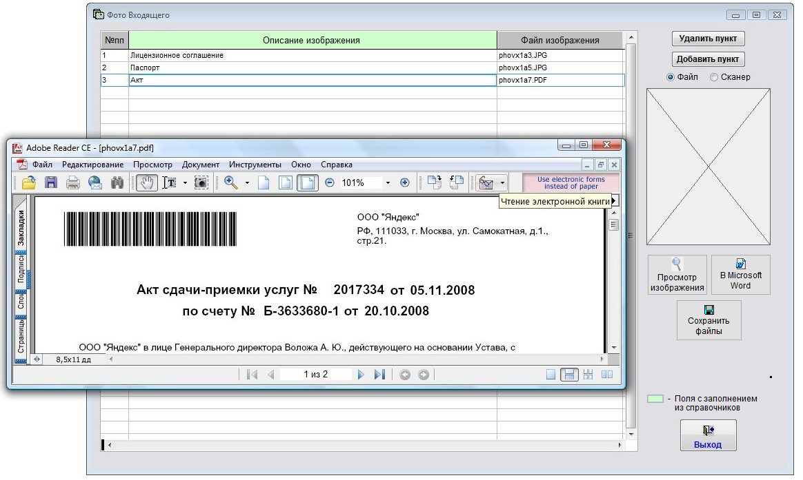 Для просмотра файлов формата PDF в разделе "Фото входящего" нажмите кнопку "Фото входящего".