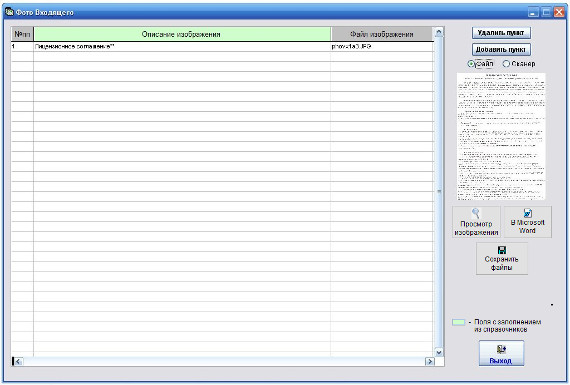 Для просмотра и вывода на печать отсканированных изображений входящего документа в карточке входящего документа нажмите кнопку "Фото входящего".
