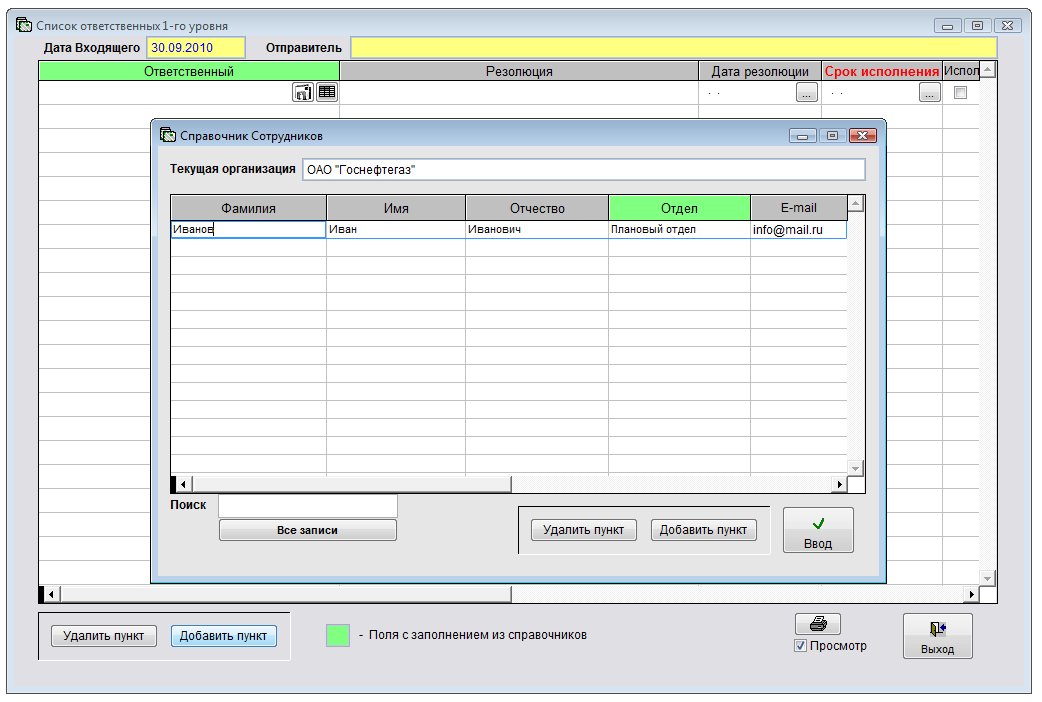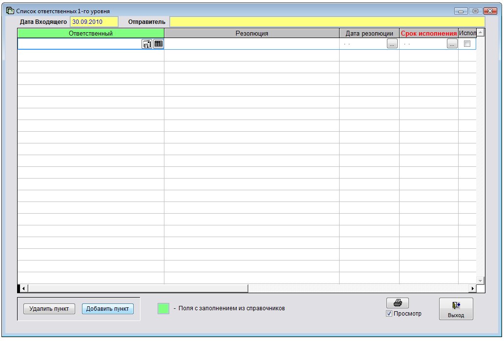 В случае, если поле, заполняемое из справочника, находится в таблице (как, например, в разделах Ответственные 1-го и 2-го уровня), то шапка соответствующего столбца выделяется цветом.