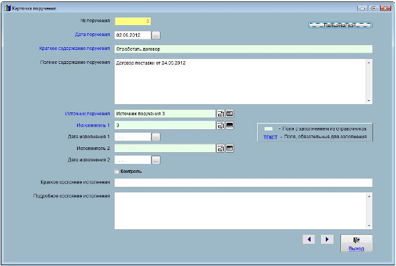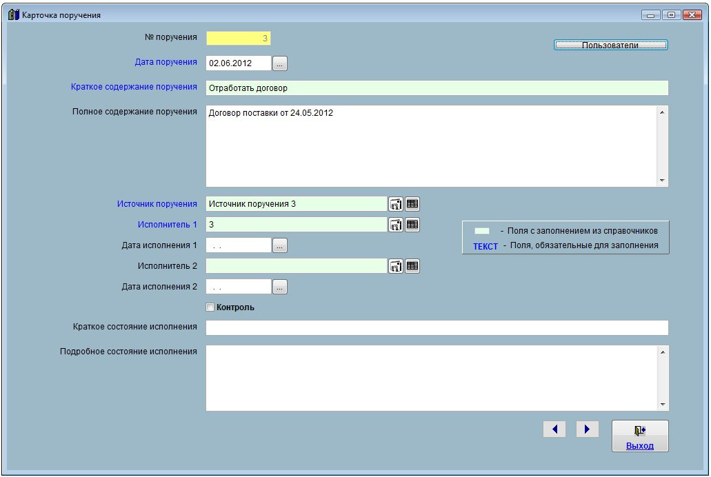 Внесите нужные изменения в карточку поручения, после внесения изменений нажмите кнопку "Выход".