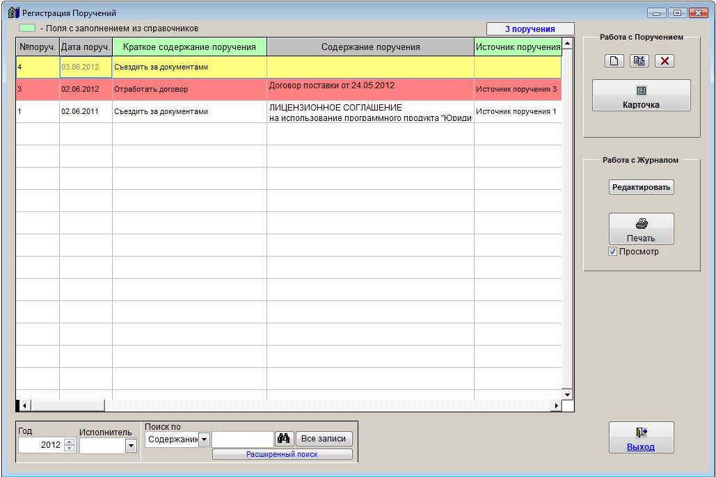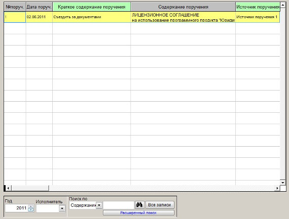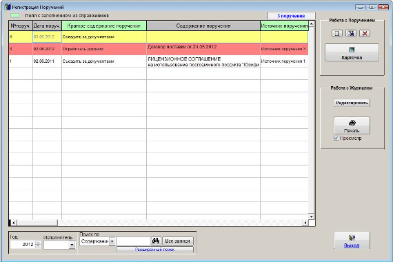 Для быстрого поиска поручений по году используйте фильтр "Год" в журнале поручений.