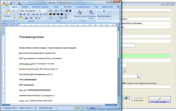 Для вывода карточки филиала в установленный Microsoft Word либо, при соответствующей