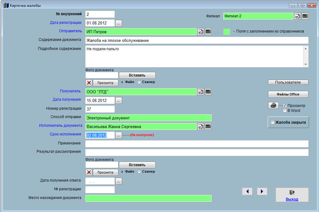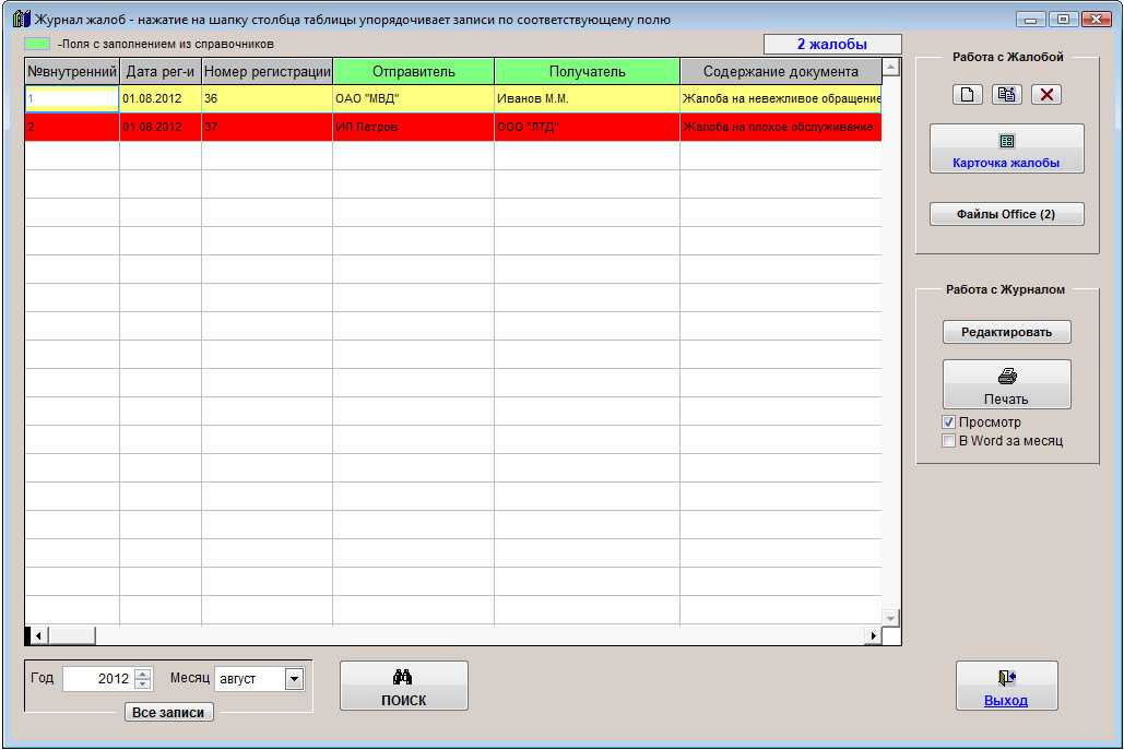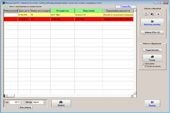 Также по данным жалобам будет осуществляться цветовое оповещение в журнале жалоб.