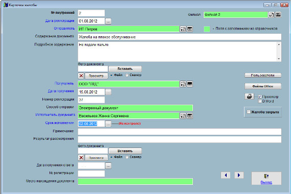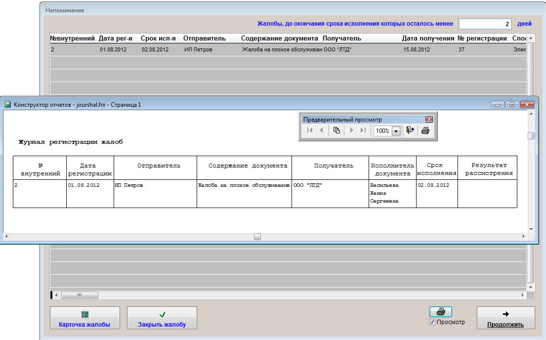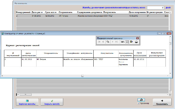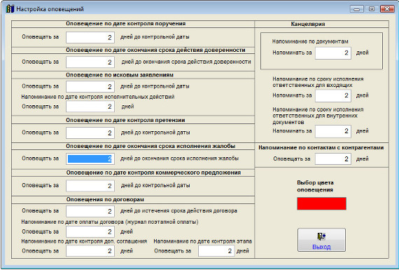 В программе "Юридический офис" можно организовать оповещение по сроку оповещения жалобы при загрузке программы, также по данному критерию существует цветовое оповещение в журнале жалоб.