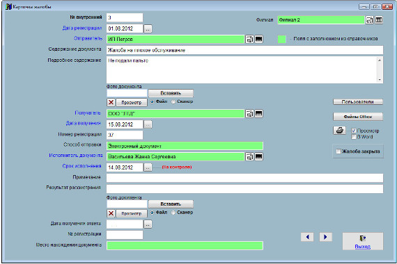 Внесите нужные изменения в карточку жалобы, после внесения изменений нажмите кнопку "Выход".