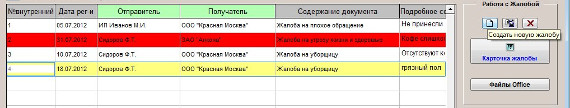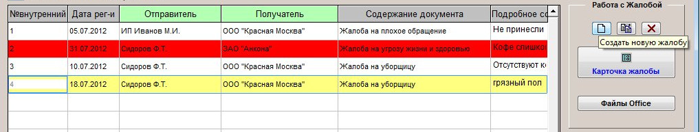 Для добавления новой жалобе в журнал нажмите кнопку "Создать новую жалобу" с изображением чистого листка в правом верхнем углу формы журнала жалоб.