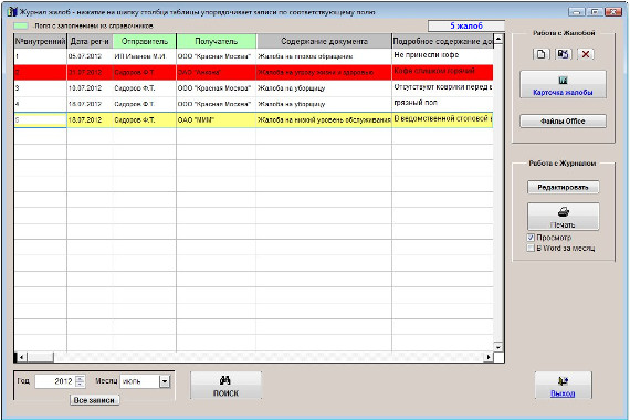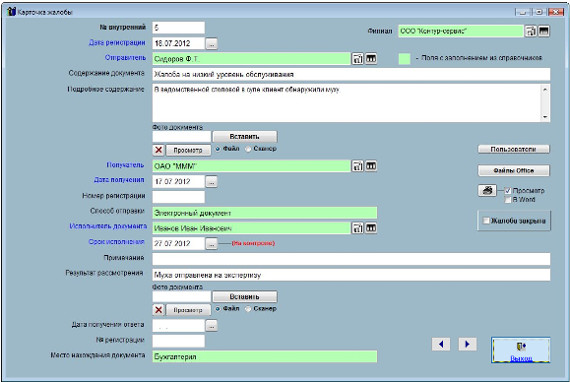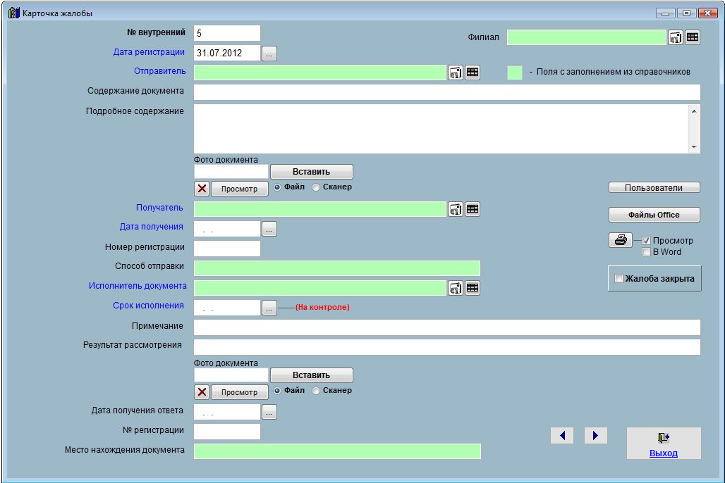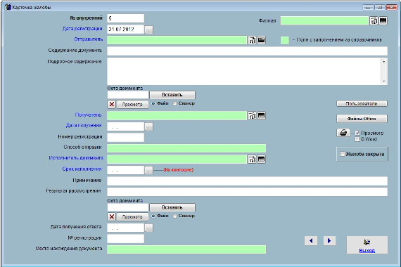 После заполнения карточки для перехода обратно в журнал жалоб нажмите кнопку "Выход".