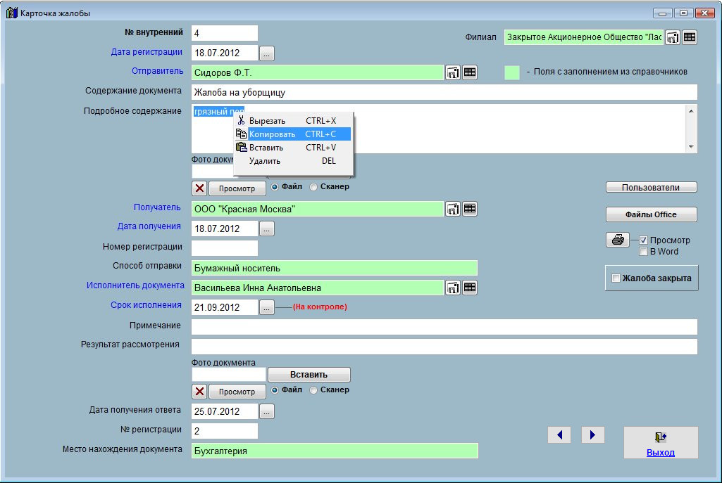 Аналогичным образом копирование/вставка осуществляется в любом разделе программы - карточке жалобы, дополнительных журналах, справочниках.