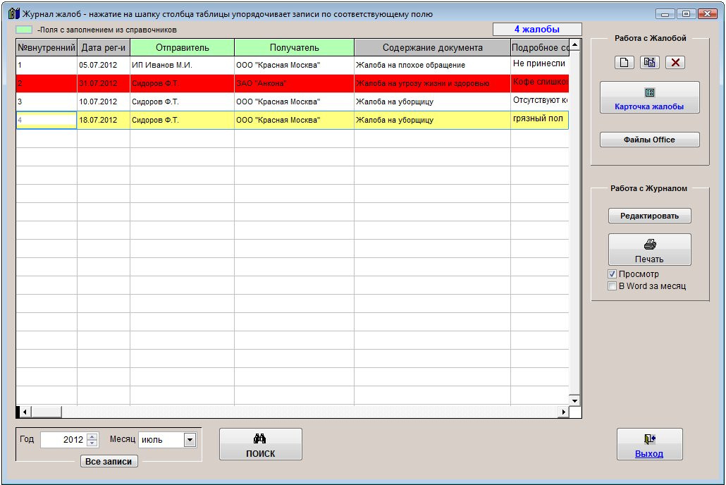 В журнале жалоб можно добавлять и удалять записи, редактировать карточку жалобы, прикреплять к карточке жалобы отсканированные копии документов, файлы и приложения, осуществлять поиск по журналу, выводить журнал на печать, отправлять уведомления по e-mail лицам, имеющим отношение к жалобам.