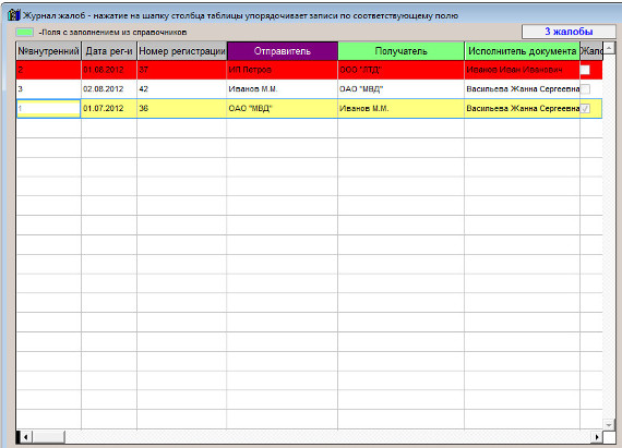Для упорядочивания таблицы жалоб по нужному столбцу нажмите мышью по шапке того столбца, по которому требуется упорядочить журнал жалоб.