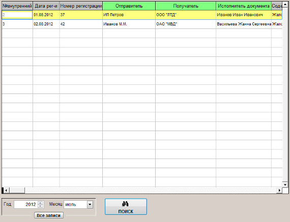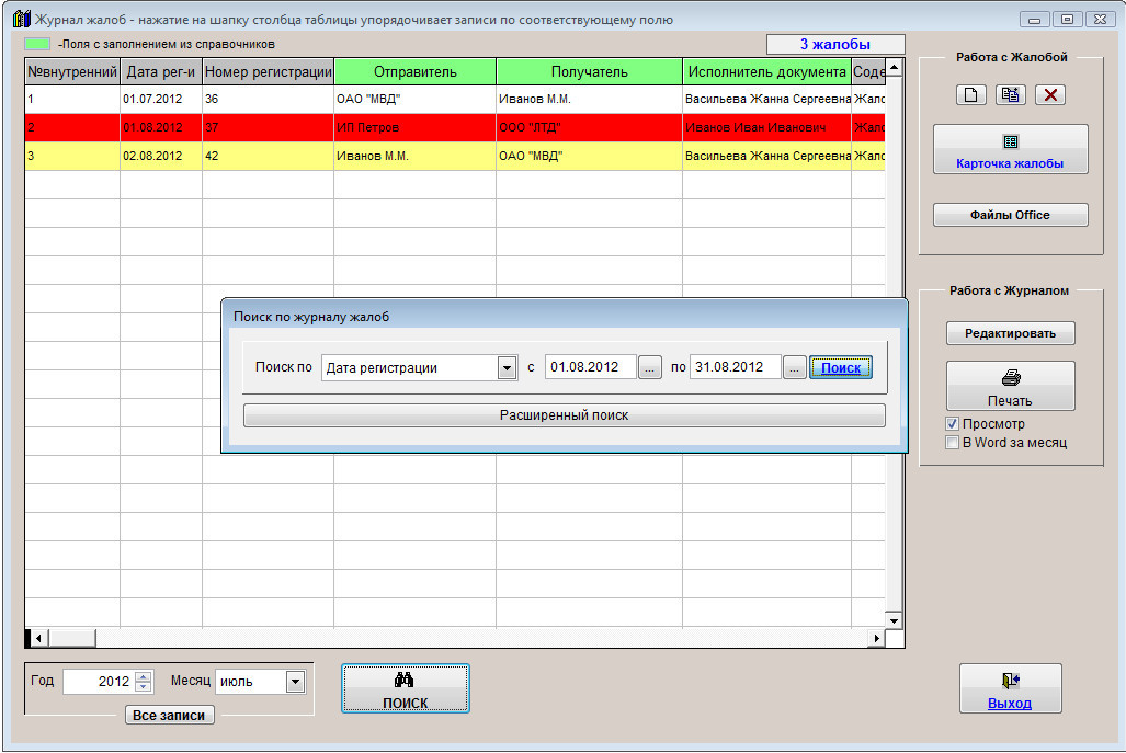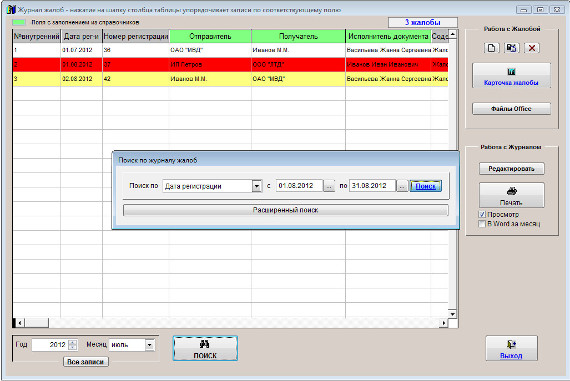 В журнале жалоб отобразятся только те записи, которые соответствуют критерию поиска, т.е. дата регистрации которых попадает в указанный интервал дат.