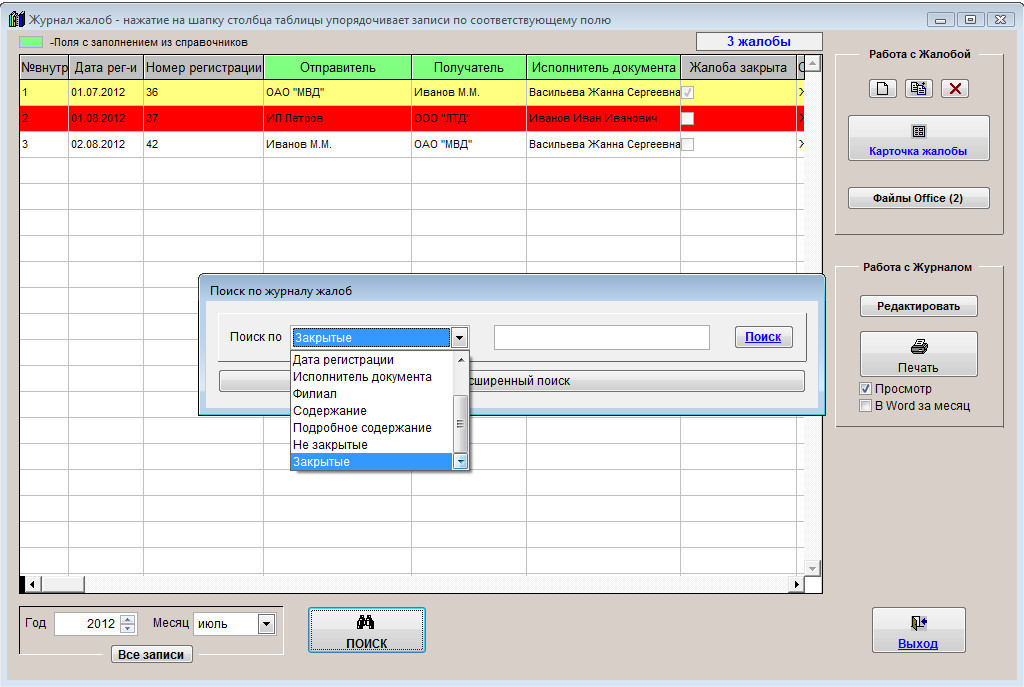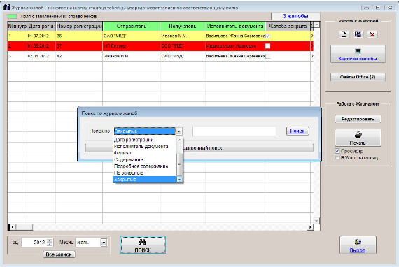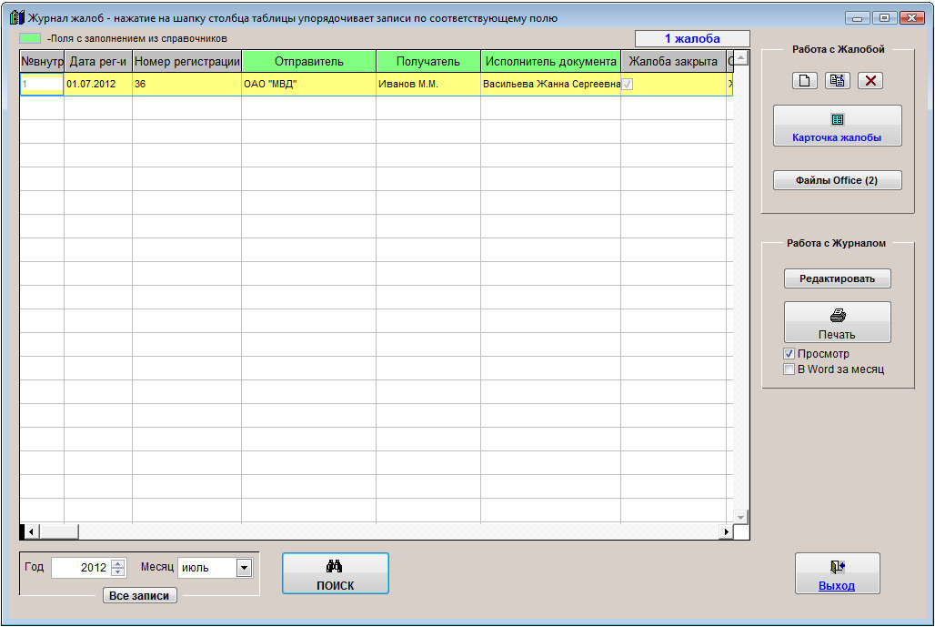 В журнале жалоб отобразятся только те записи, которые соответствуют критерию поиска, т.е. у которых установлена галочка "Жалоба закрыта".