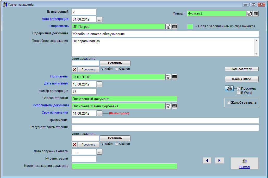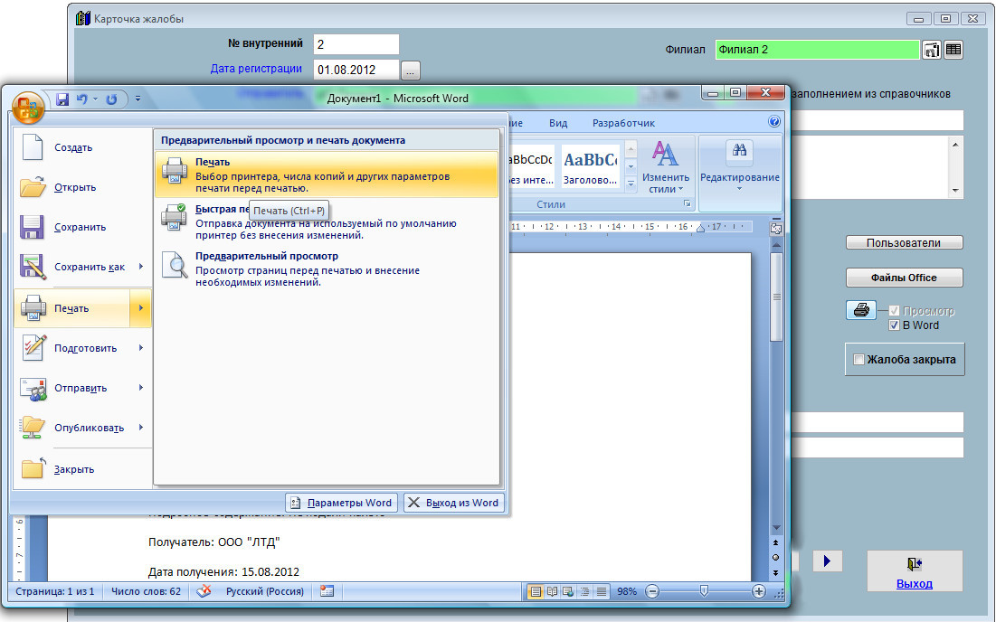 Для вывода карточки жалобы в установленный Microsoft Word либо, при соответствующей