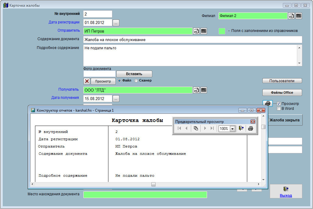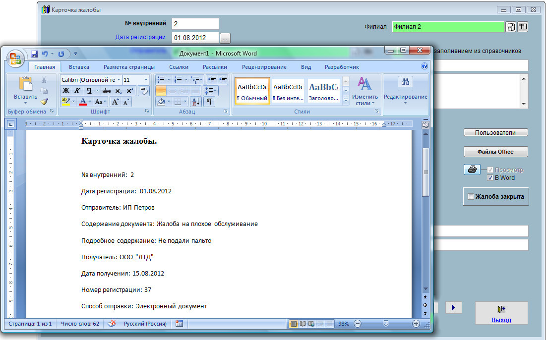 Карточка жалобы будет сформирована в MS Word либо, при соответствующей
