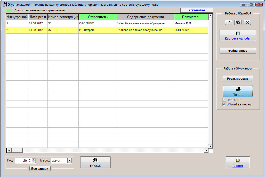 Для вывода журнала жалоб за месяц (выбирается в группе Год-Месяц слева под таблицей) в установленный Microsoft Word либо, при соответствующей