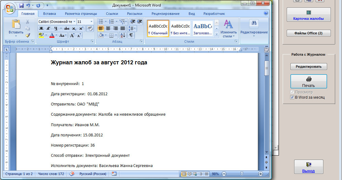 Журнал жалоб будет сформирован в MS Word либо, при соответствующей