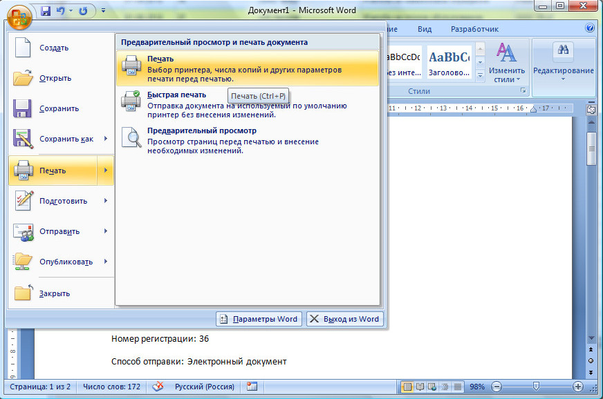 Для печати документа из MS Word либо OpenOffice Writer используйте кнопку с изображением принтера либо пункт меню Файл(Главное меню)-Печать.