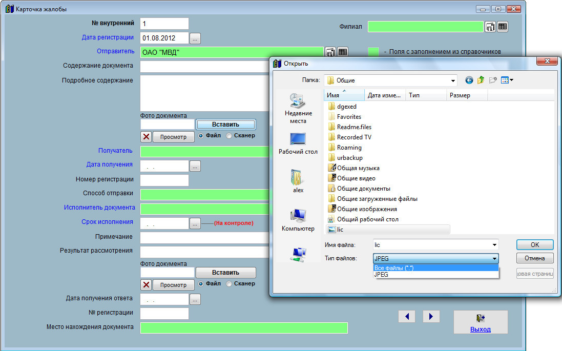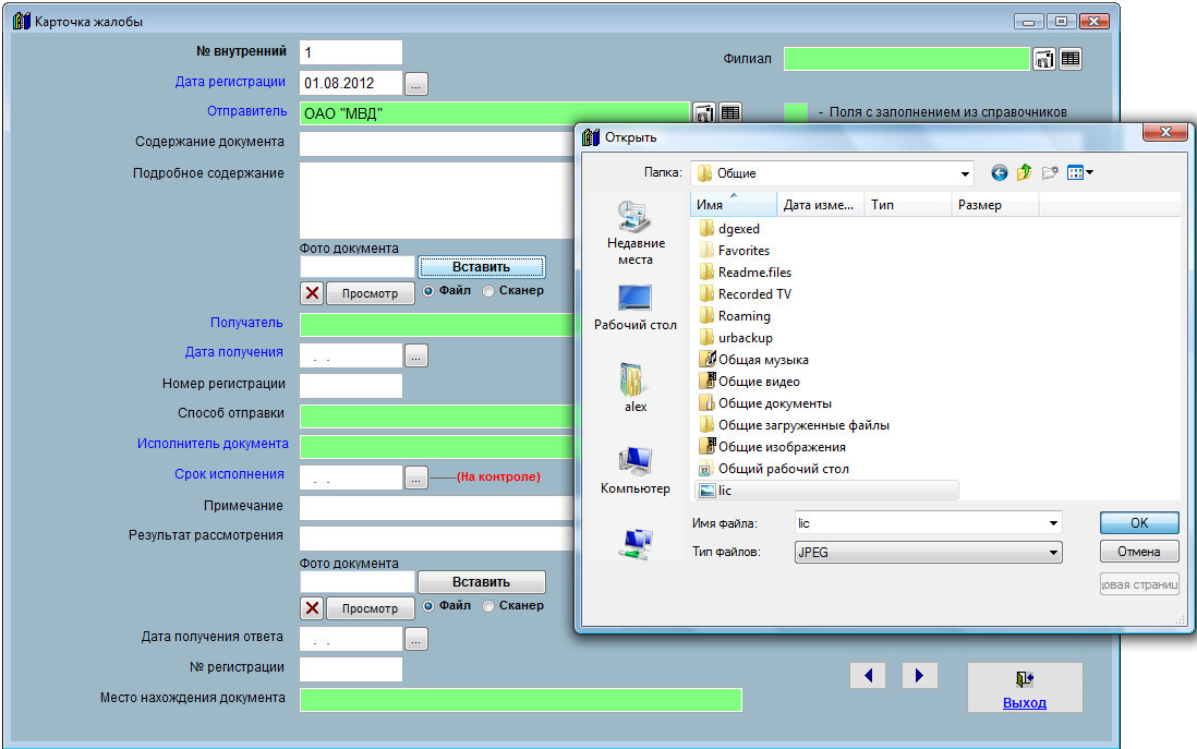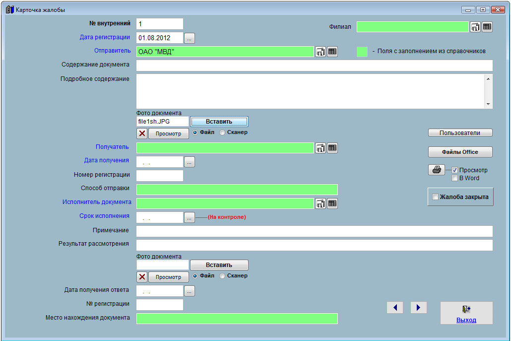 В карточке жалобы имеется возможность прикрепить отсканированные копии жалобы.