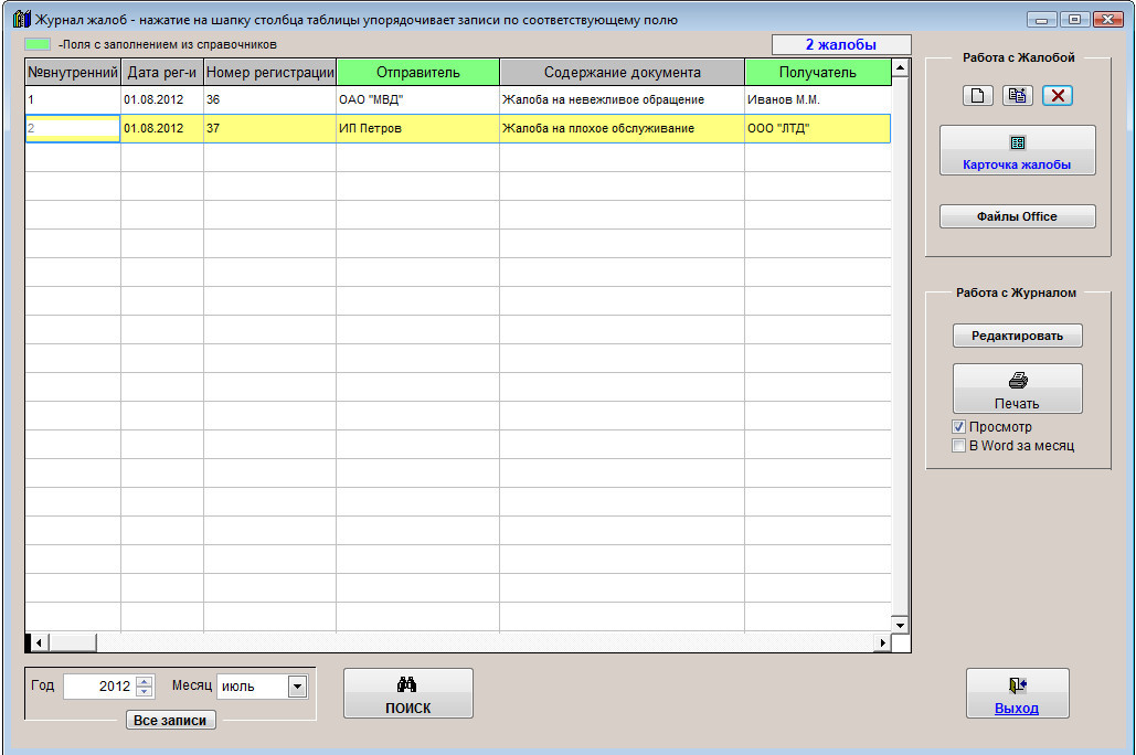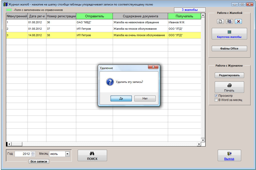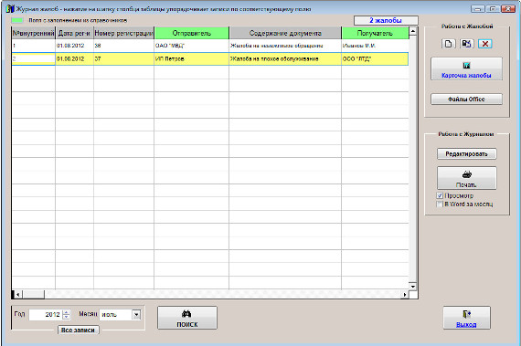Для удаления жалобы в журнале жалоб установите курсор на жалобу с нужным номером.