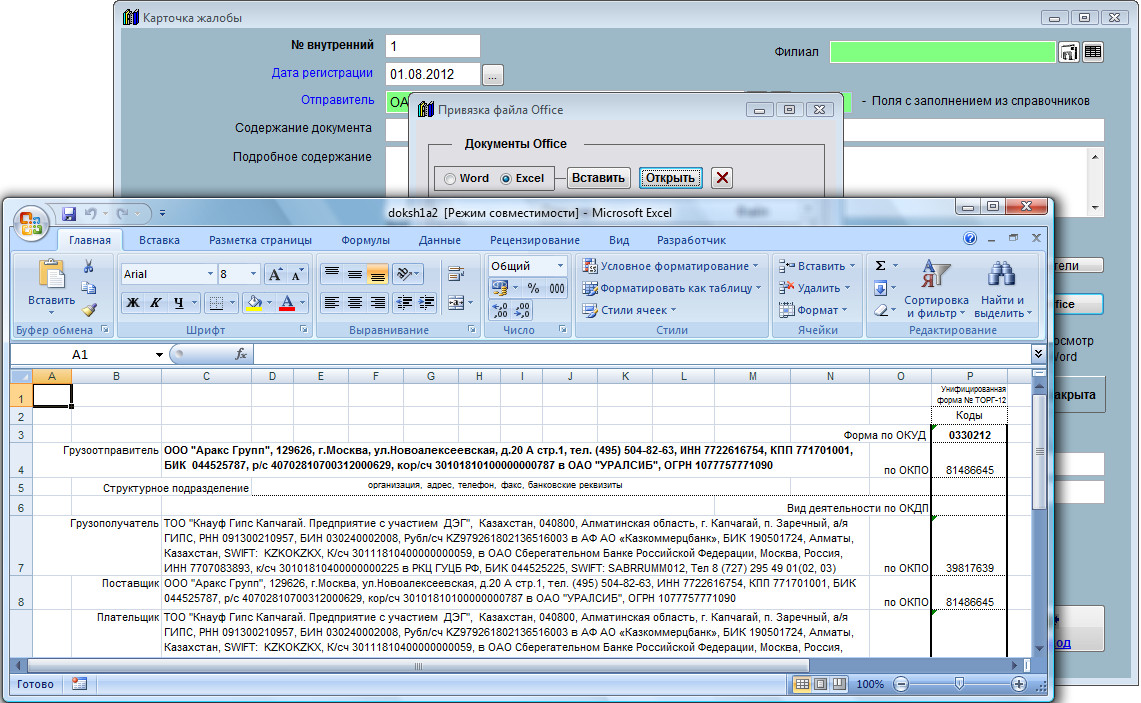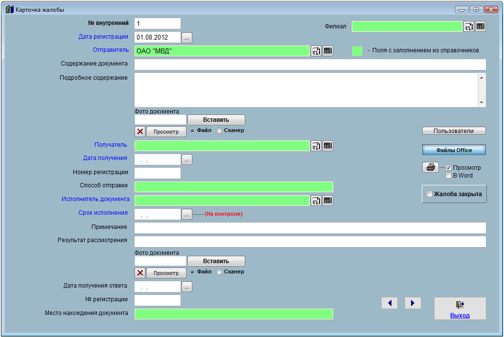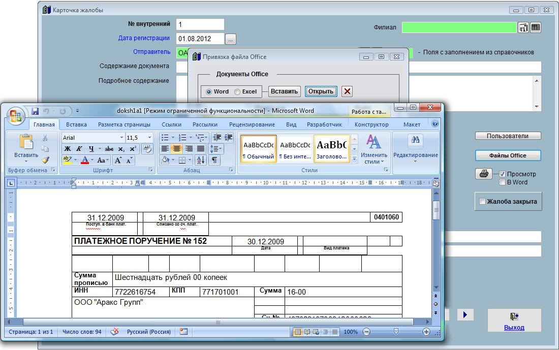 Для просмотра, редактирования и печати прикрепления файлов Word и Excel нажмите кнопку "Файлы Office" в карточке жалобы.