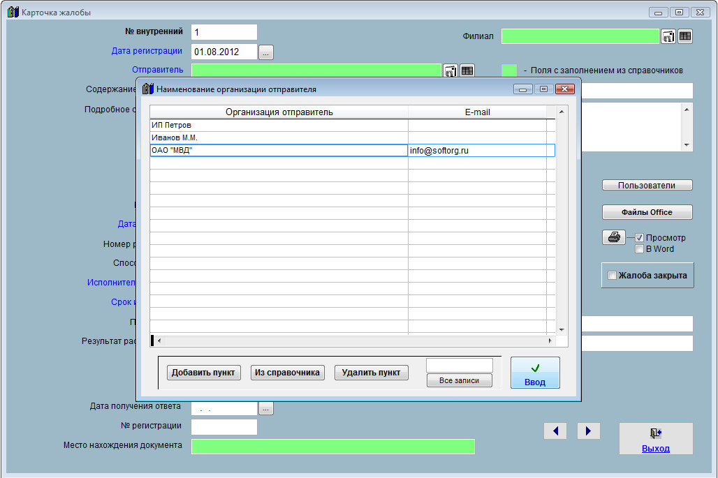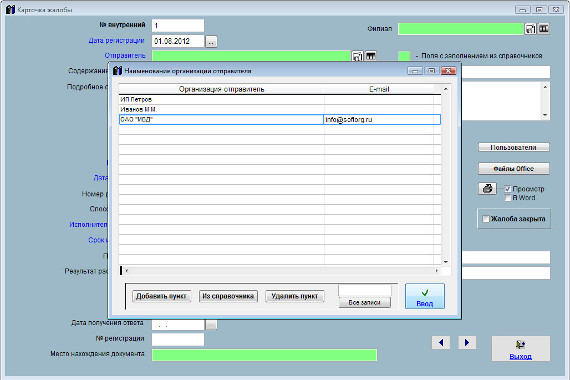 Для заполнения из справочников полей, выделенных соответствующим цветом, дважды щелкните (DblClk) по тому полю, которое требуется заполнить.