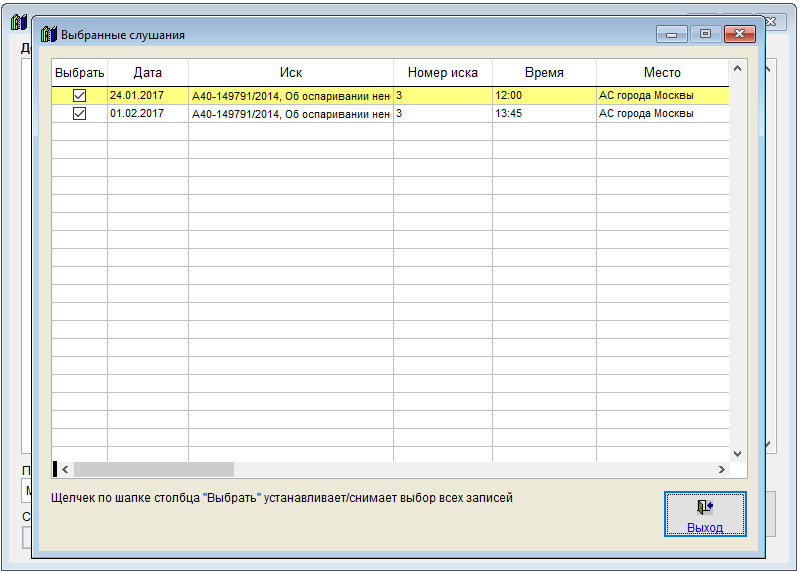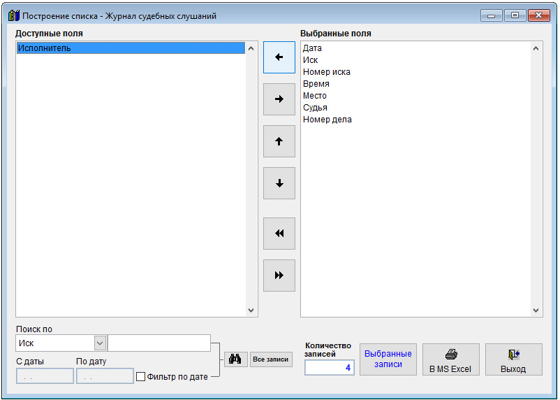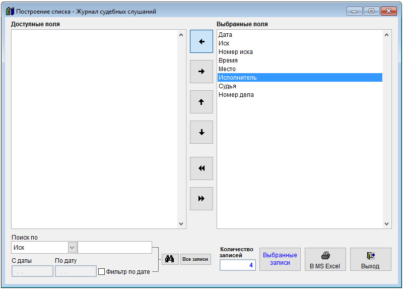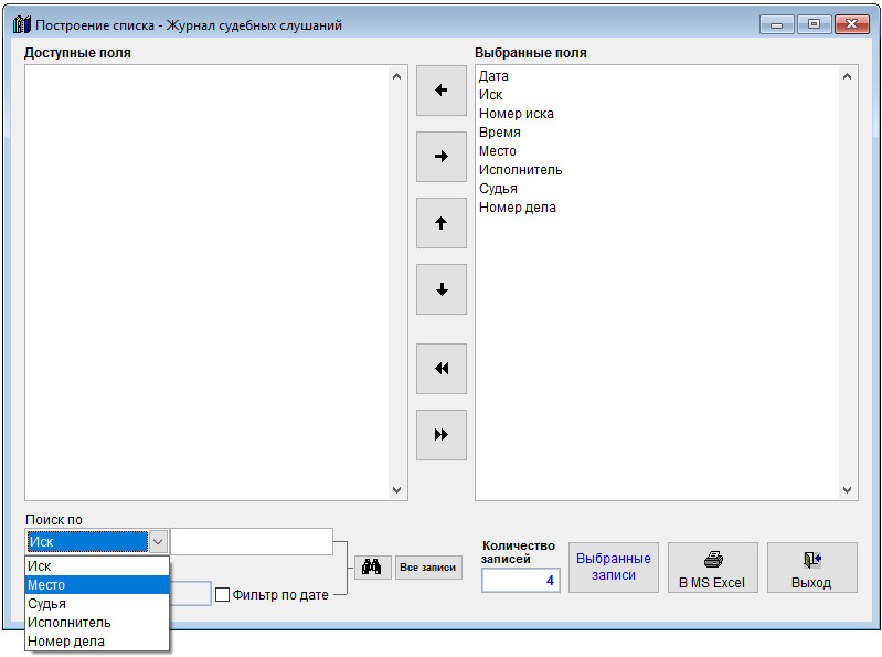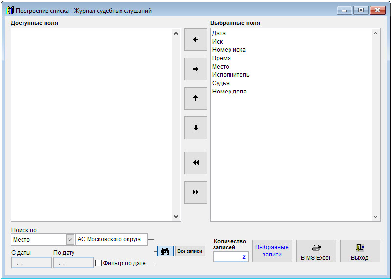 В окне настройки выберите те поля карточки судебного слушания, которые требуется экспортировать в MS Excel (OO Calc).