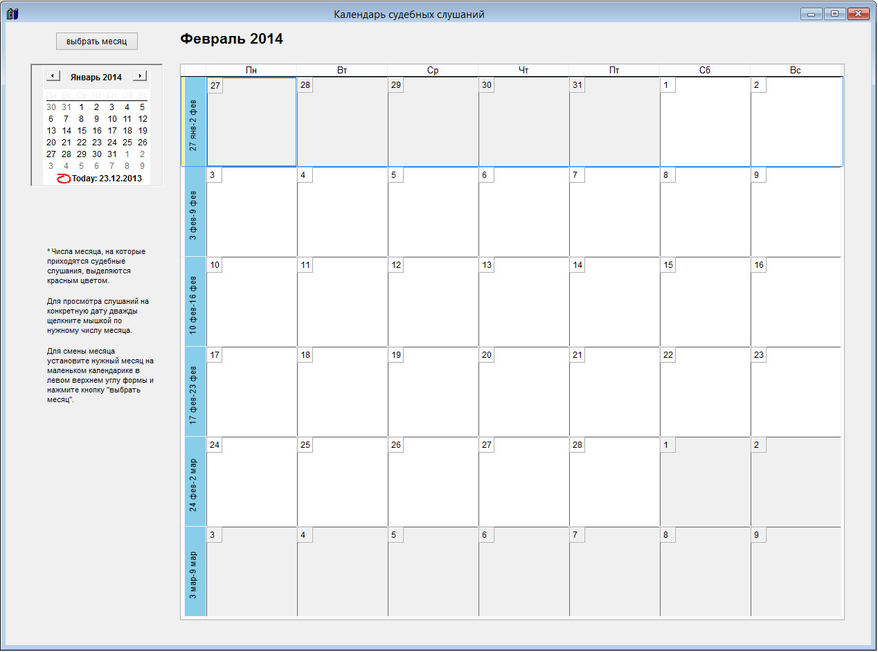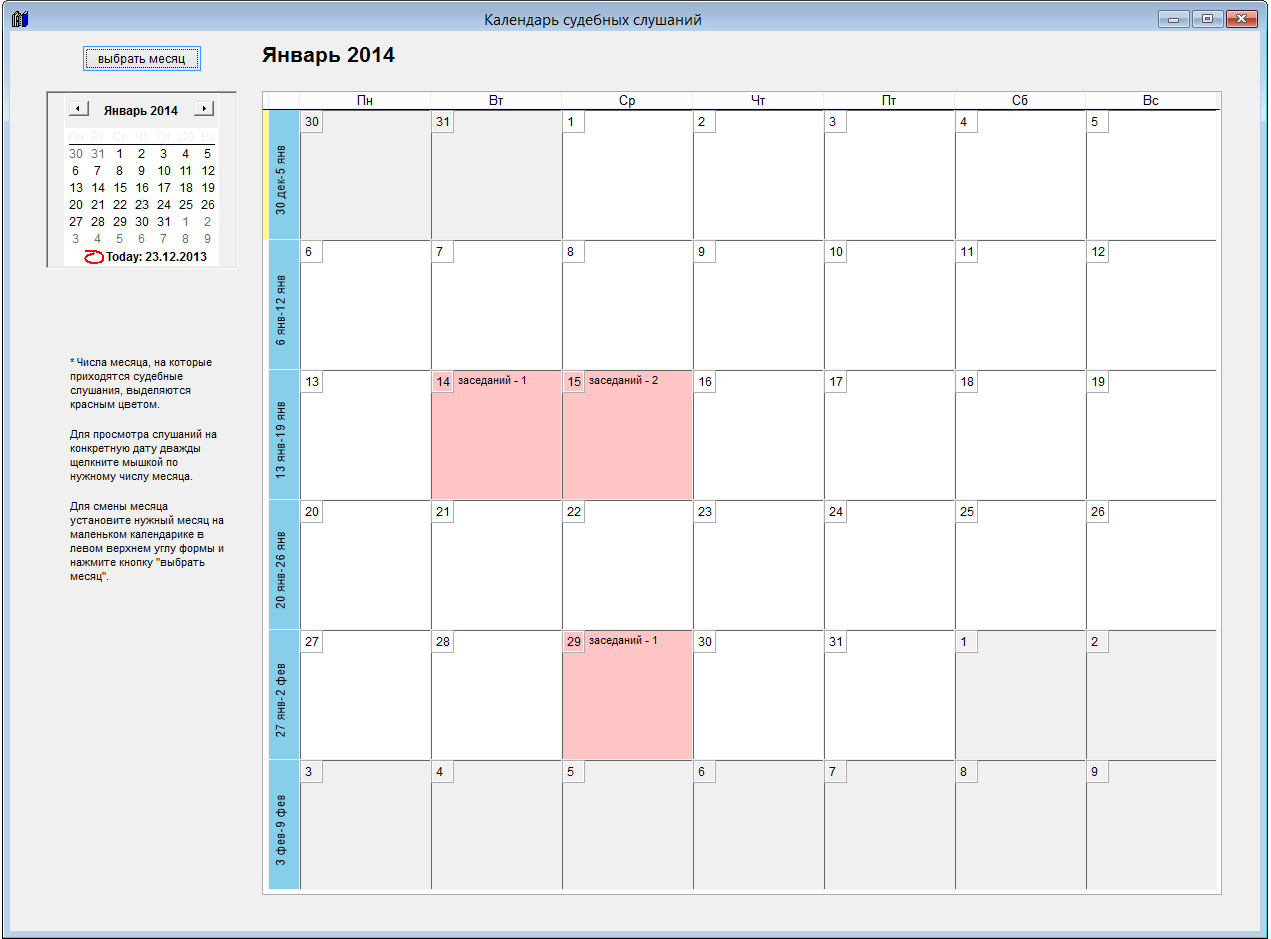 На большом календаре отобразятся судебные слушания за выбранный месяц.