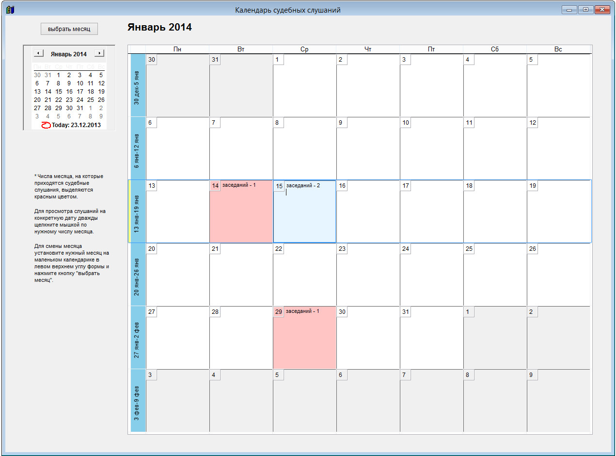 Для просмотра слушаний на конкретную дату дважды щелкните мышкой по нужному числу месяца.