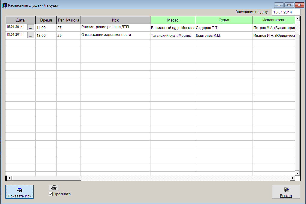 По каждому слушанию можно посмотреть указанный для слушания иск, нажав кнопку "Показать иск".