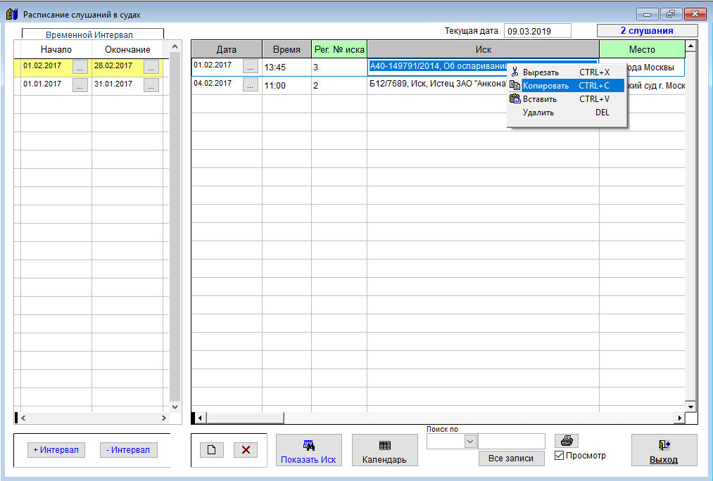 В расписании слушаний можно добавлять и удалять записи за периоды, осуществлять поиск по журналу, выводить на печать список слушаний, просматривать карточки исков, то которым назначены слушания.