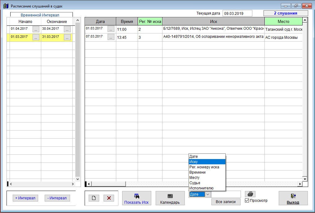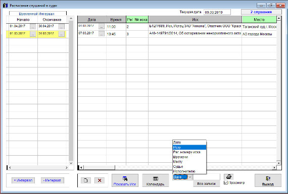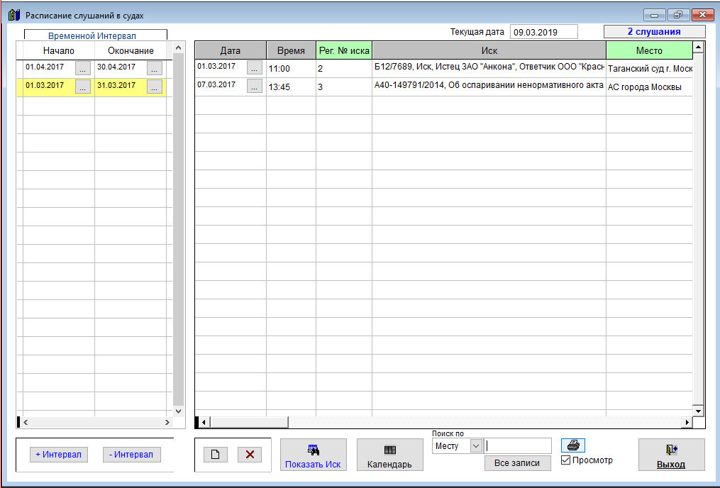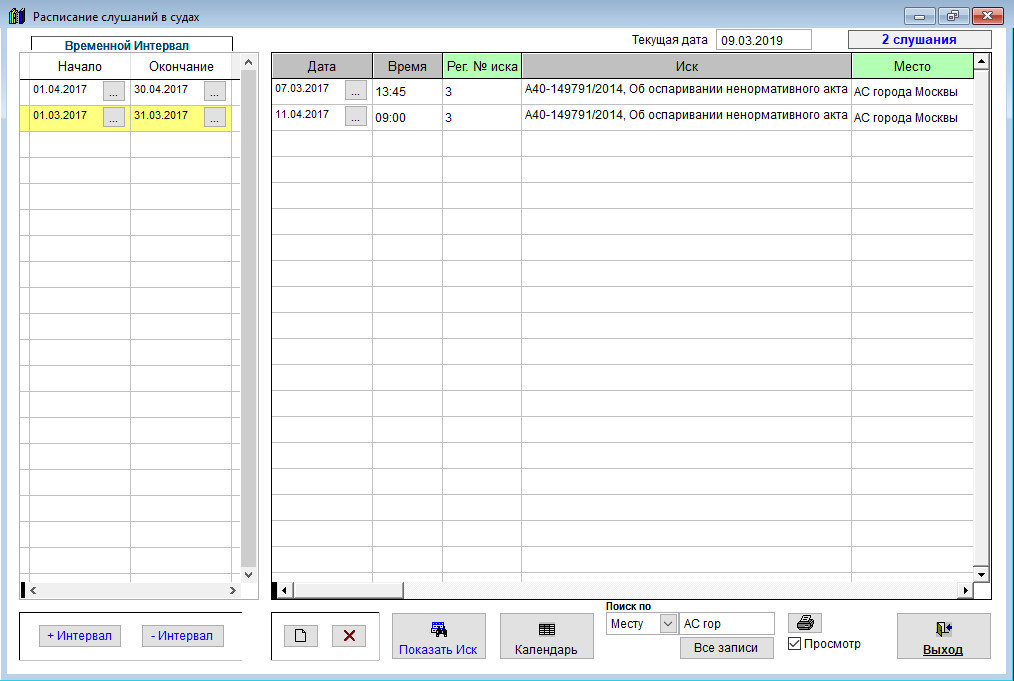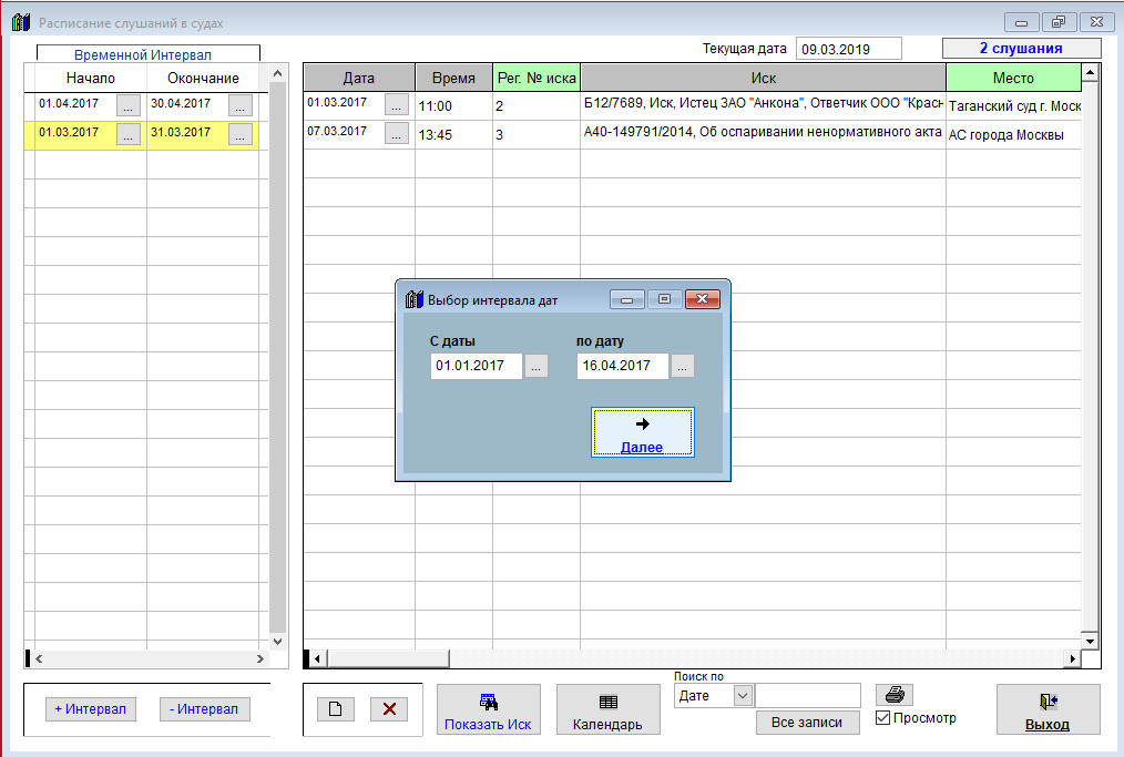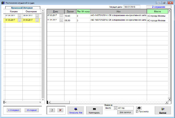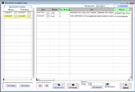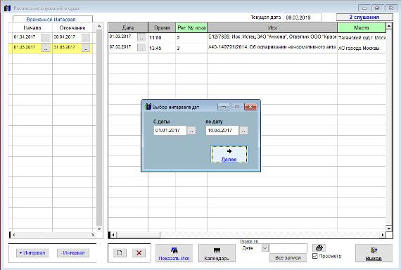 Для отображения слушаний в нужном интервале выберите нужный интервал дат в левой таблице.