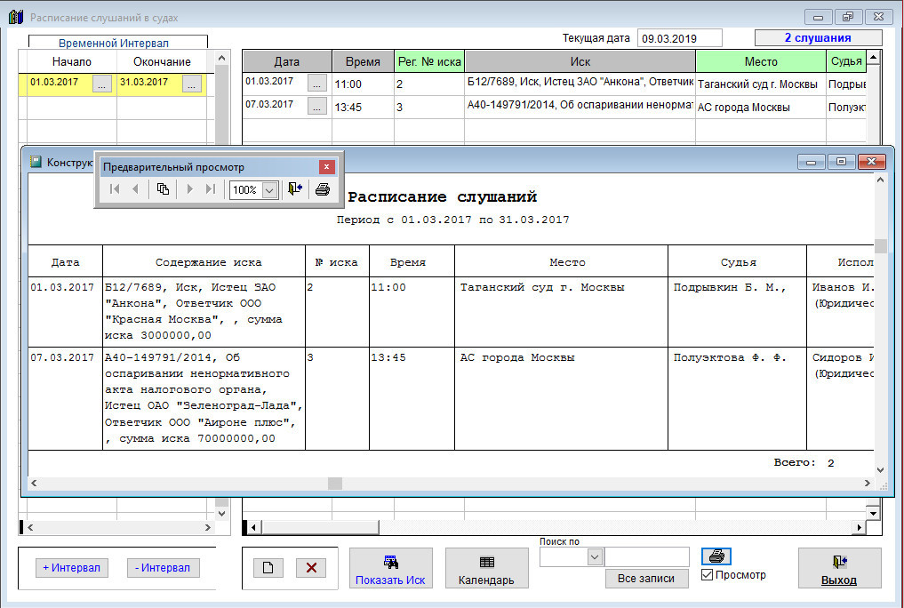 Для печати расписания слушаний нажмите на кнопку "Печать" с изображением принтера под таблицей слушаний.