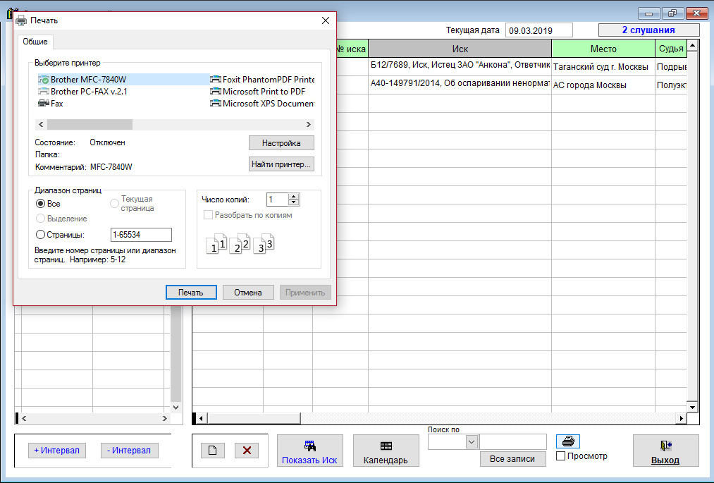 Выберите нужный принтер, установите количество копий и нажмите на кнопку "Печать" с изображением принтера.