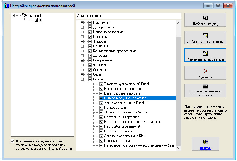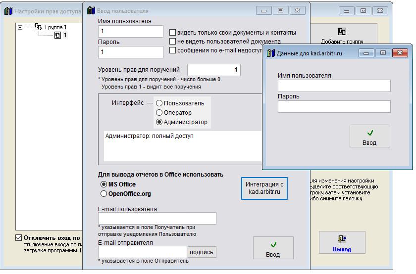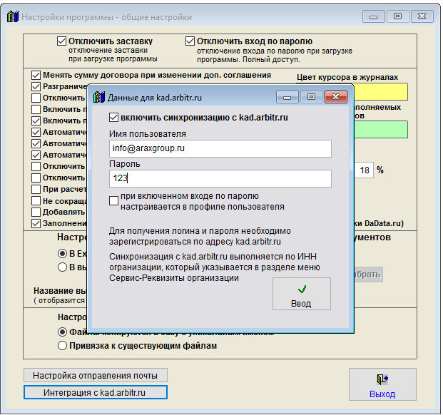 В меню "Сервис-Настройка интерфейса", в разделе "Интеграция с kad.arbitr.ru" должны быть указаны имя пользователя и пароль для сервиса kad.arbitr.ru (предварительно нужно зарегистрироваться по адресу https://kad.arbitr.ru).