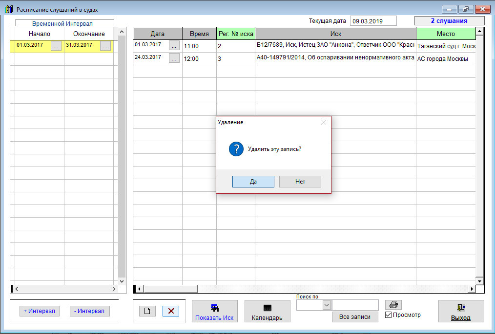 В появившемся окне нажмите кнопку "Да" для подтверждения удаления выбранного слушания.