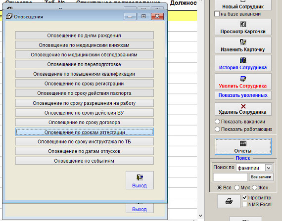 Если в разделе Отчеты-Оповещения-Напоминание об аттестациях установлена галочка "Включить напоминание", то при запуске модуля Сотрудники откроется окно оповещения об аттестациях.