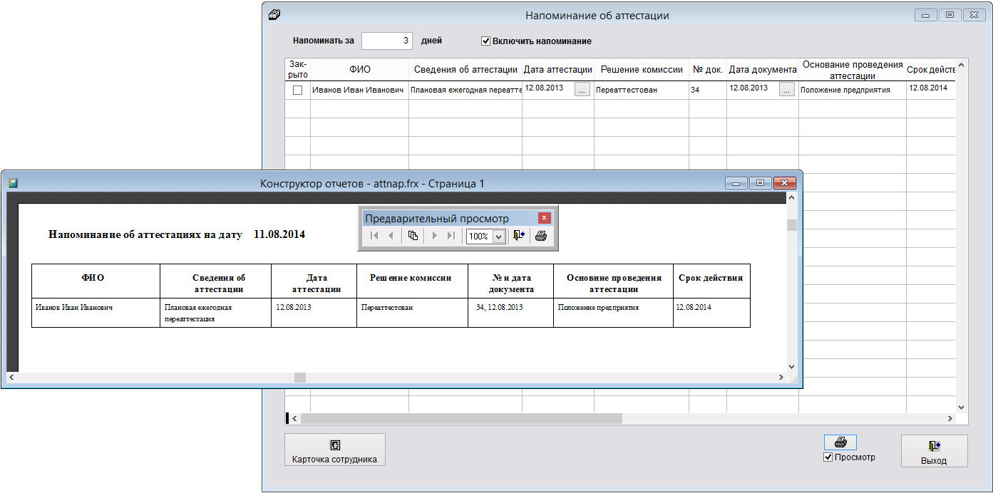 Напоминание появляется при загрузке модуля Сотрудники, также есть возможность просмотра окна напоминания в разделе Отчеты.
