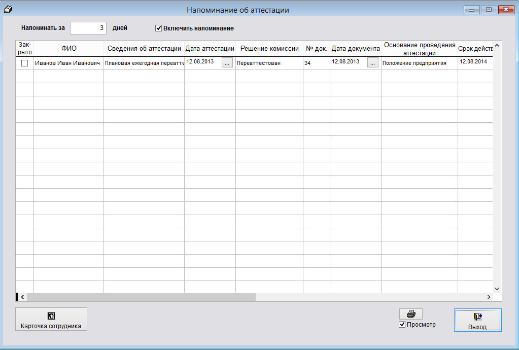 В напоминание попадут те незакрытые аттестации сотрудников, до срока действия которых осталось менее указанного количества дней.