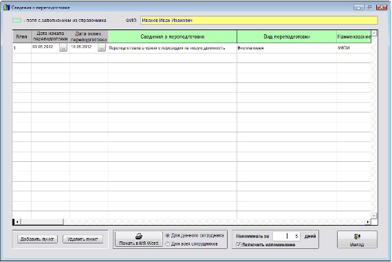 Откроется раздел Напоминание по дате окончания свидетельства о переподготовке.