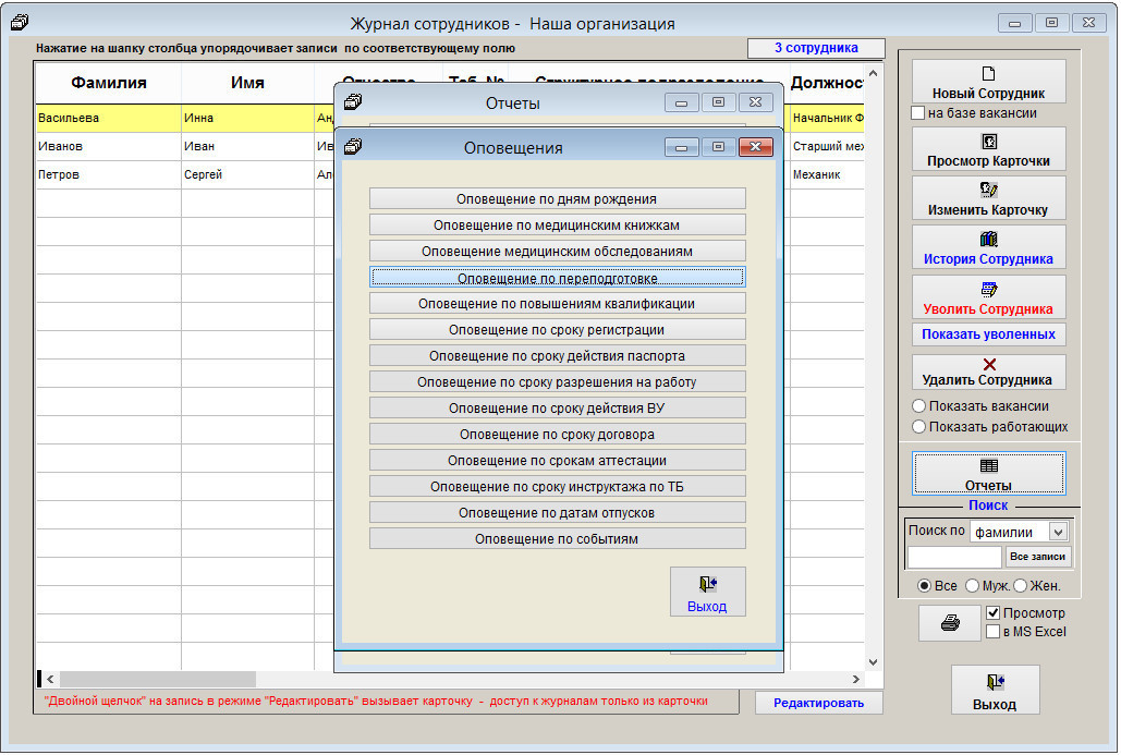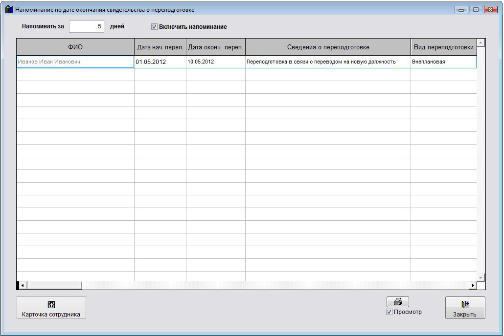 Если в разделе Отчеты-Оповещения-Напоминание по переподготовке установлена галочка "Включить напоминание", то при запуске модуля Сотрудники откроется окно оповещения по переподготовке.