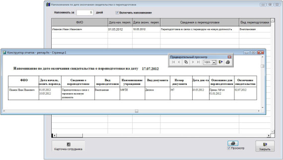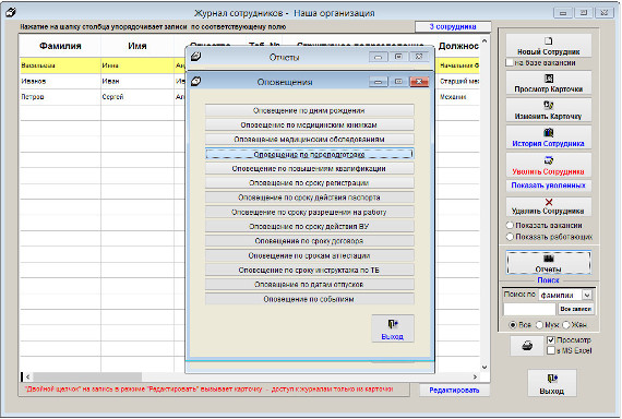 Напоминание появляется при загрузке модуля Сотрудники, также есть возможность просмотра окна напоминания в разделе Отчеты.