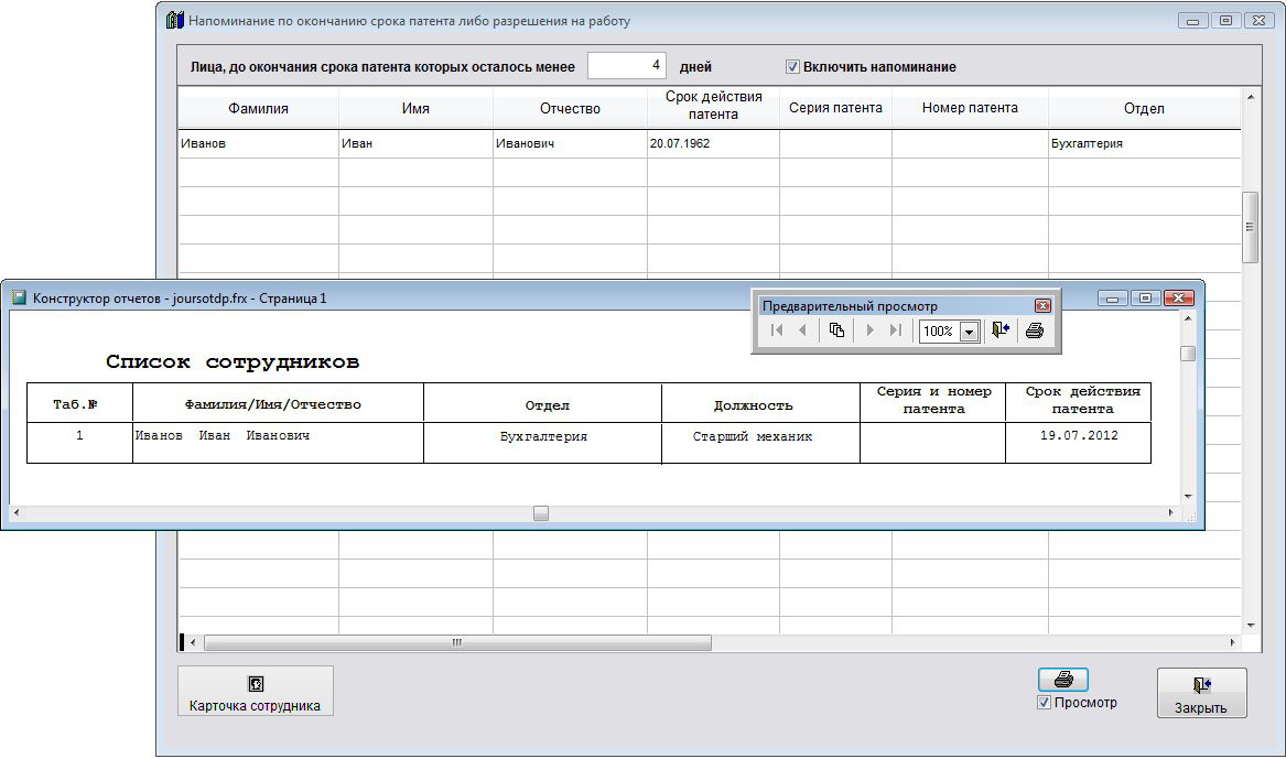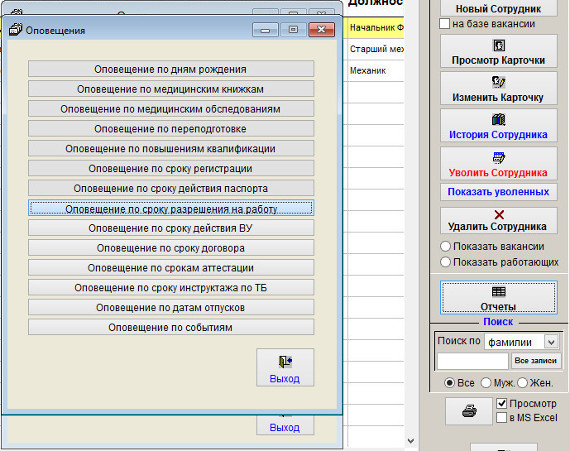 Напоминание появляется при загрузке модуля Сотрудники, также есть возможность просмотра окна напоминания в разделе Отчеты.